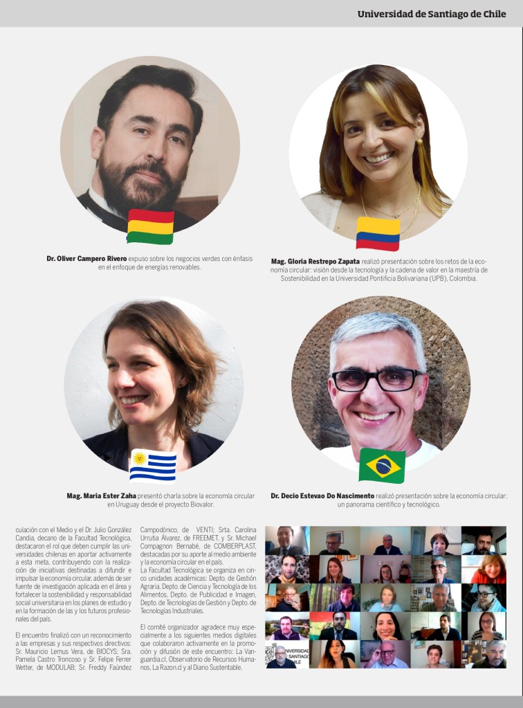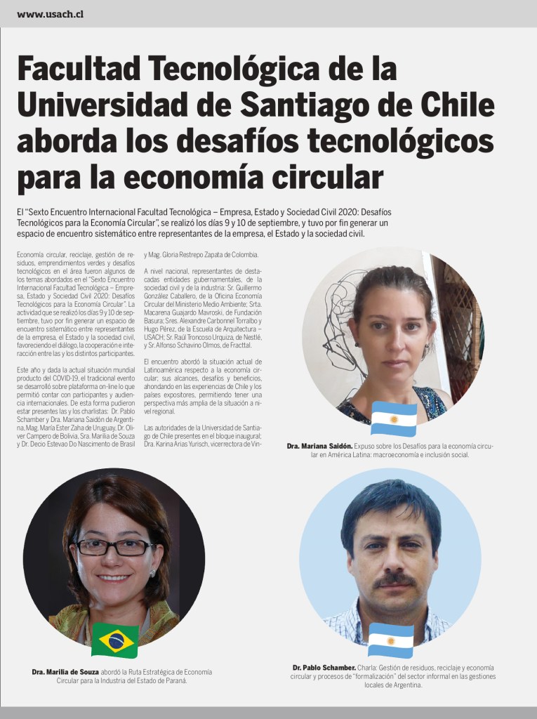 Mariana Saidón participó del sexto encuentro internacional de la facultad tecnológica de la Universidad de Santiago de Chile. En el mismo fue invitada a dar la charla magistral «Desafíos para la Economía Circular en América Latina: macroeconomía e inclusión social». A su vez, el diario «La Tercera» de Chile desatacó la participación de expertos como Mariana Saidón en dicho encuentro.