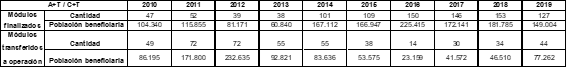 A diciembre de 2019, dichos programas alcanzaron resultados importantes en cantidad de obras (905), personas beneficiadas (1.453.584) y empleos generados (912)[31]. No obstante, tal como ilustra la siguiente tabla, existe una brecha considerable entre las obras que aún no prestan servicios (en la jerga, módulos finalizados) y las que sí lo hacen (módulos transferidos a operación).