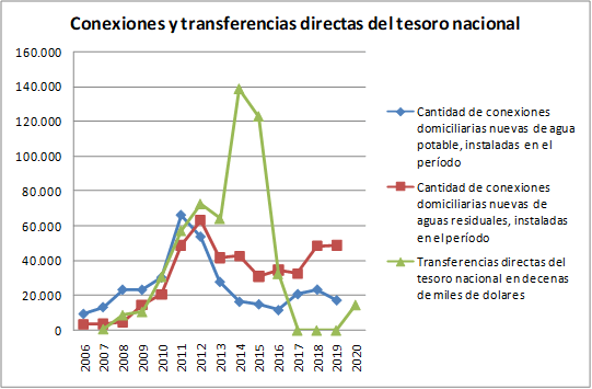 En ese marco, el conocimiento técnico que supo acumular el Estado Nacional a lo largo de los años puede ser uno de los factores que ayudan a explicar su éxito relativo. No obstante, sin perjuicio de lo anterior, el factor que parece ser determinante es, ni más ni menos, que la cantidad de recursos económicos que sólo el Estado Nacional puede volcar al sector. A modo de ilustración, el siguiente gráfico muestra como la empresa incorporó nuevas conexiones domiciliarias de agua y cloacas todos los años desde su creación. Allí también puede verse el racconto de las transferencias directas del tesoro nacional a la empresa[23]. Las diferencias que se observan entre gestión y gestión a nivel nacional señalan los intentos de readecuar las tarifas a los costos del servicio.