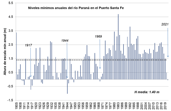 El río Paraná, que constituye uno de los principales cursos de agua de la Cuenca del Plata, está experimentando desde hace más de un año, situaciones de déficit de agua que tienen implicancias de las más variadas índoles. La Figura 1[1] ilustra los valores de los niveles mínimos anuales en (m) registrados en el hidrómetro del Puerto de Santa Fe, desde el inicio de los registros, en 1905.