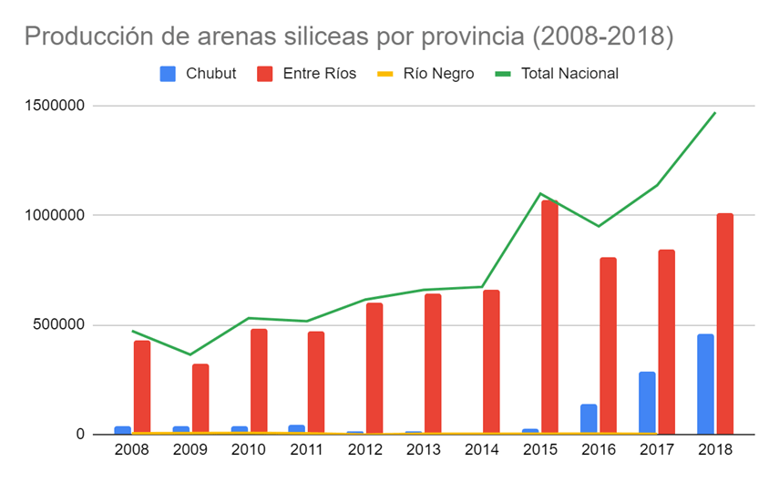 Referido al valor estratégico y económico de la arena, las empresas de hidrocarburos buscan abaratar al máximo los costos y por ende prefieren explotar las canteras nacionales antes que importarlas del exterior, construyendo vínculos sólidos y perdurables con productores mineros para evitar fallas en la entrega del suministro. Incluso, empresas como YPF han desarrollado un sofisticado andamiaje de integración vertical para su autoabastecimiento. De acuerdo a los datos publicados por la Secretaría de Política Minera (2019) hasta 2015 este insumo provenía en gran medida de Estados Unidos y China, incrementando la estructura de costos de los pozos[2], pero a partir de 2016 es posible identificar un aumento sostenido de la producción nacional liderada por Entre Ríos y en menor medida por Chubut (ver gráfico Nº1).