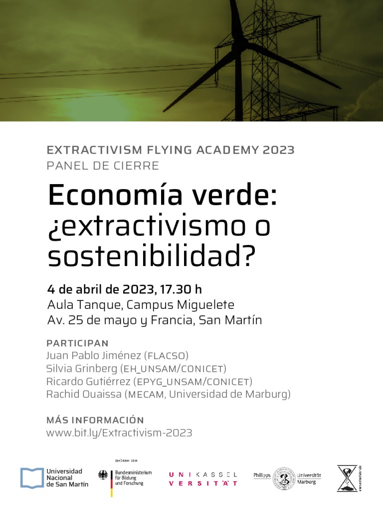 Ricardo Gutiérrez, Elisabeth Möhle, Lucas Christel y Juan Martín Azerrat participarán de la actividad destinada a explorar la relación teórica y empírica entre extractivismo y economía verde. Organizada por la Universidad Nacional de San Martín, la Universidad de Kassel y la Universidad de Marburg, la actividad se desarrolla el 3 y 4 de abril en el Campus Miguelete (Av. 25 de mayo y Francia, San Martín).