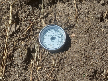 Imagen 4 La medición de temperaturas y el registro de éstas es una obligación de la normativa. La fase termófila es la que posibilita la muerte de patógenos. En la imagen un termómetro de aguja clavado en la pila marca casi 70°C en el interior de ésta.