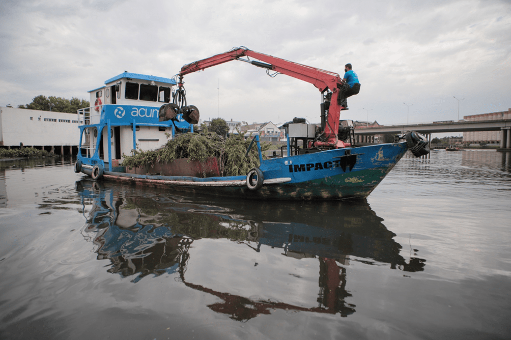 Imagen 1: Barco de ACUMAR realizando la limpieza del espejo de agua en el Río Matanza – Riachuelo, Buenos Aires, Argentina.